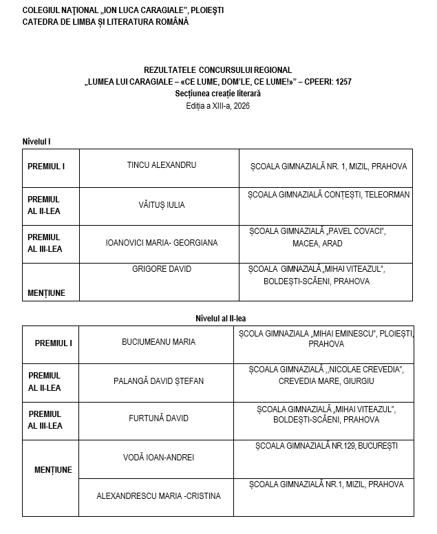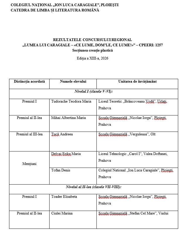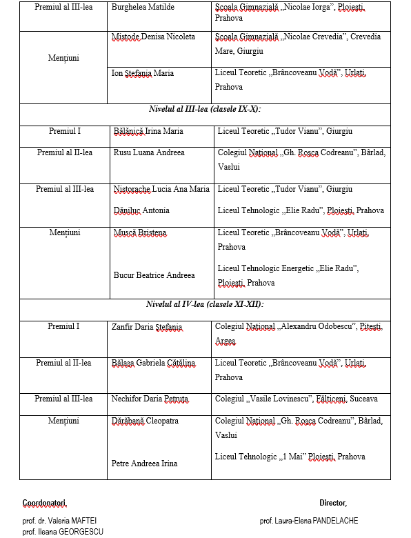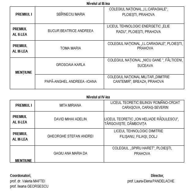 Se vor acorda premiile I, II și III, pentru fiecare nivel. Se pot acorda câte două mențiuni. La propunerea partenerilor educaţionali, numărul premiilor poate fi modificat.